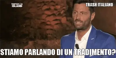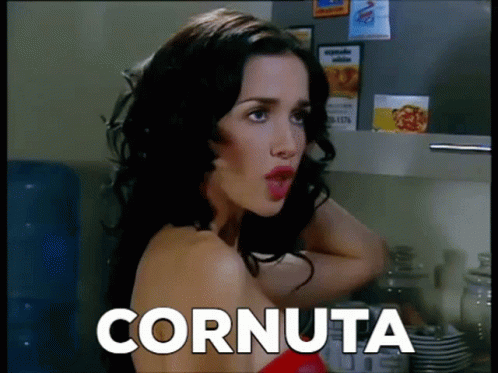 A woman reacts with shock as the word 'Cornuta' (cuckolded) appears, likely from the show Uomini E Donne.