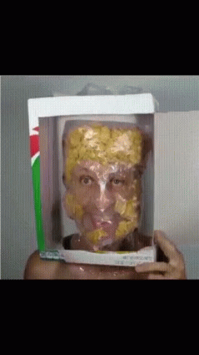 A person pours milk into a plastic bag of cornflakes placed over their head, creating a messy mask.