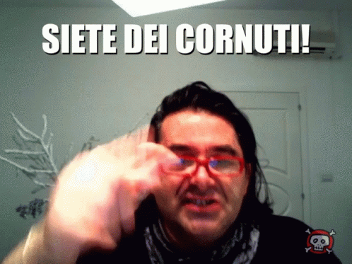 Man in glasses points at camera, shouting 'Siete Dei Cornuti!' (You are horned ones!) in an Italian meme.