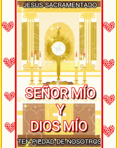 A golden monstrance with the Eucharist, surrounded by candles, with the prayer 'My Lord and My God, have mercy on us'.