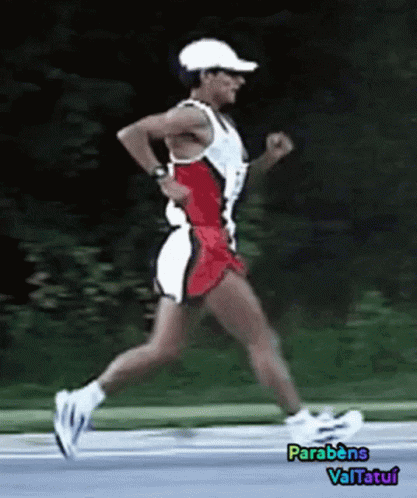 Athlete participating in the ValTatuí running race, wearing a red and white outfit on a road.