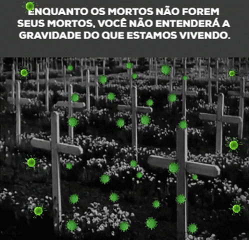 A cemetery scene with green virus particles, accompanied by a Portuguese caption about understanding the gravity of loss during a pandemic, referencing Bolsonaro.