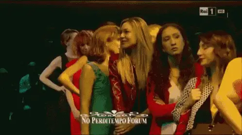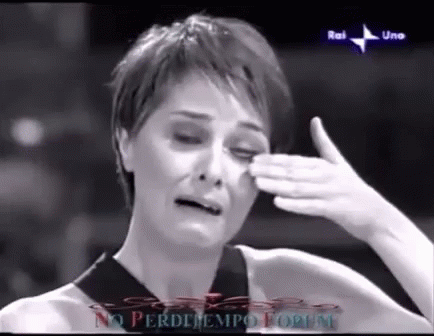 Paola Cortellesi expresses deep emotion, crying and smiling, with 'Grazie!!' on screen, from a black and white broadcast.