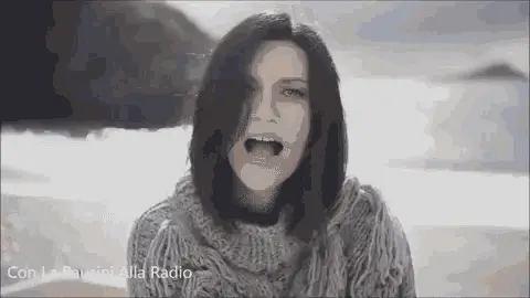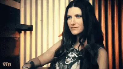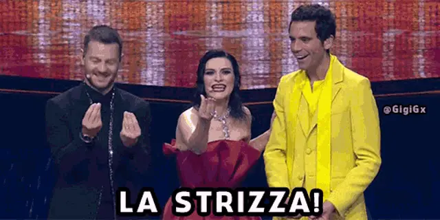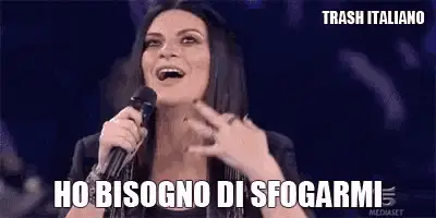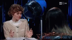 Paola Cortellesi in character, sitting at a table on the set of 'No Perditempo Forum'.
