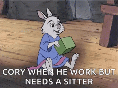 Cory the cartoon rabbit struggles to work while needing a sitter, looking tired and holding a green box.