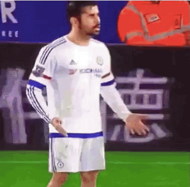 Chelsea player Diego Costa reacts on the field during a football match, gesturing with his hands.
