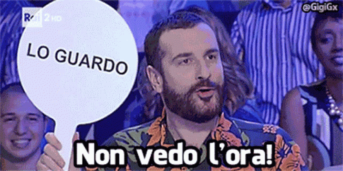 Costantino Della Gherardesca holding a 'LO GUARDO' sign, exclaiming 'Non vedo l'ora!' on Rai 2.