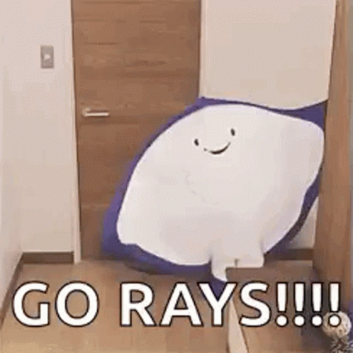A person in a large, smiling stingray costume enthusiastically says 'Go Rays!!!!'