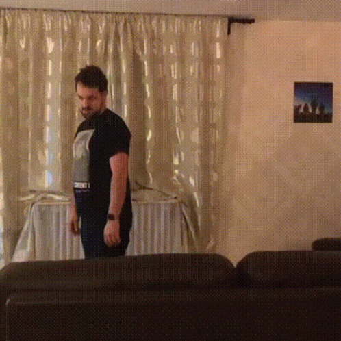 A person attempts the Jim Carrey Challenge, dramatically falling backward onto a couch in a living room.