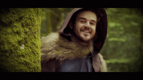 Frere Tuck, wearing a fur-trimmed hooded cloak, waves from behind a mossy tree in a forest.