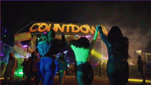 Three excited women with raised hands celebrating at a vibrant 'Countdown' music festival at night.