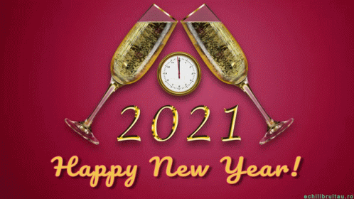 Celebrate the New Year with champagne glasses clinking, a clock nearing midnight, and a festive 'Happy New Year 2021' message.