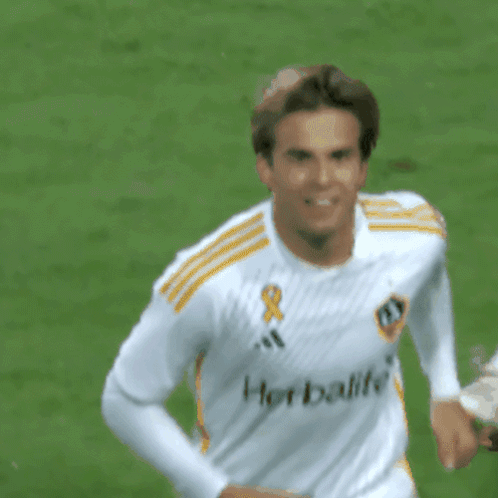 Riqui Puig, wearing his LA Galaxy jersey, counts with his fingers during a Major League Soccer game.