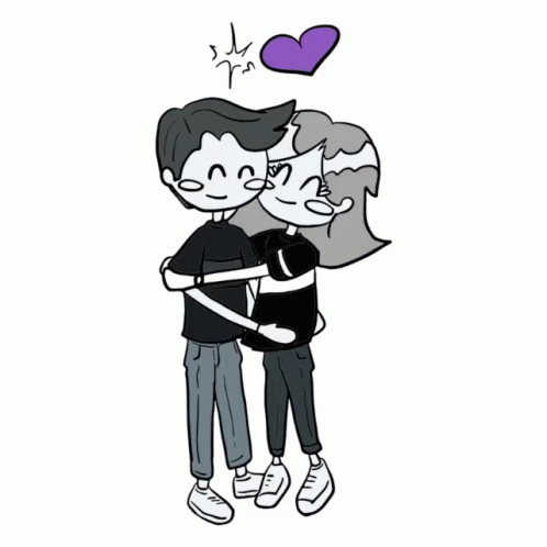 A sweet black and white cartoon drawing of a couple sharing a loving hug with hearts floating above them.