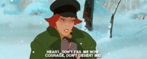 Anastasia in the snow, pleading 'Heart, don't fail me now. Courage, don't desert me!'
