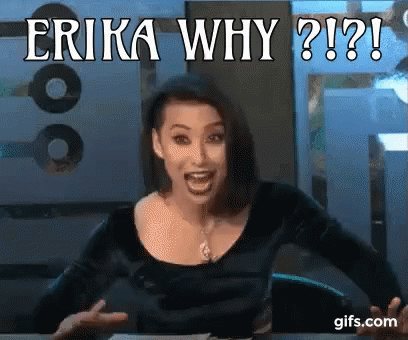 Erika Ishii with a surprised and questioning expression, pointing a finger while asking 'Erika Why?!?'