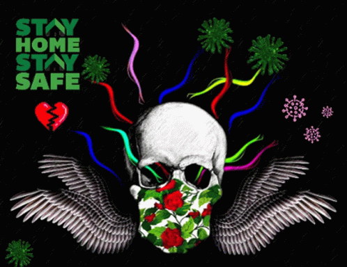 Digital artwork depicting a skull with a floral mask, wings, and COVID-19 symbols, promoting 'Stay Home, Stay Safe' with a broken heart.