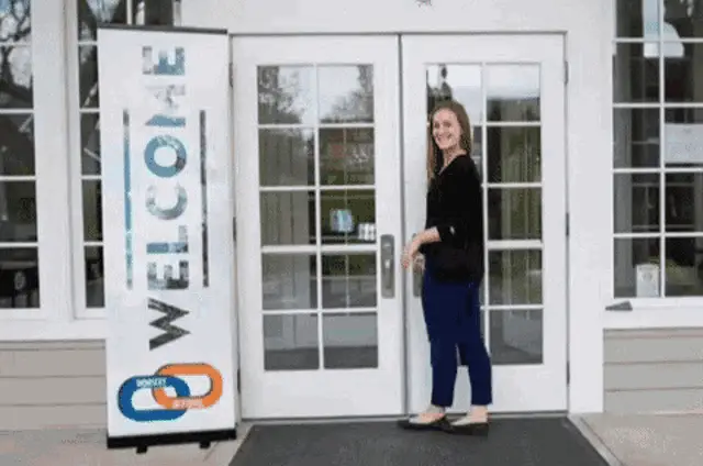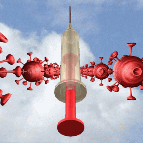A 3D animation depicting a vaccine syringe combating red coronavirus particles against a cloudy sky.