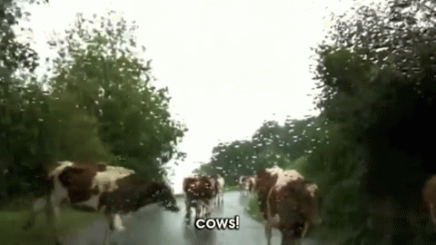 A car encounters a herd of cows on a rainy road, with one cow appearing to confront the vehicle.