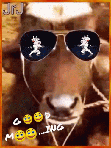 A cool cow wearing sunglasses with dancing cows reflected in them, wishing "Good Morning".