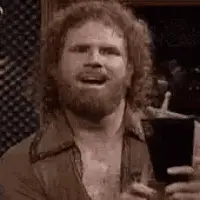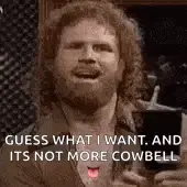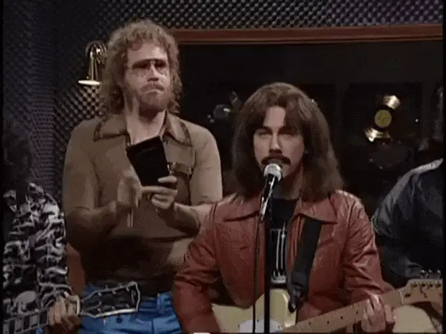 A man with curly hair and a beard holds a drumstick, ready to play the cowbell.