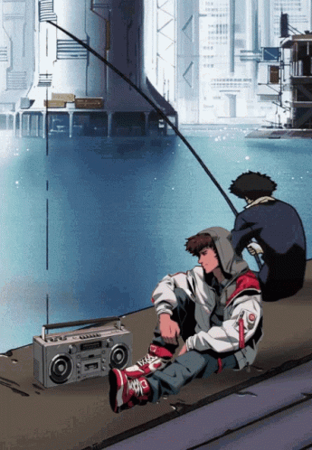Cowboy Bebop Azuki characters enjoy a lofi chill fishing scene by the water with a boombox.