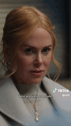 Nicole Kidman reacts with a stern 'That was inappropriate,' wearing a white coat and a gold necklace.
