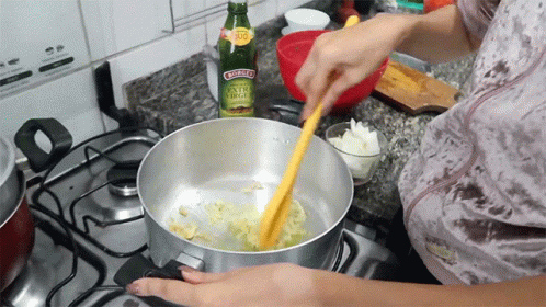 Caroline Lima cooking, sauteing garlic in a pot on the stove, preparing a delicious meal in her kitchen.