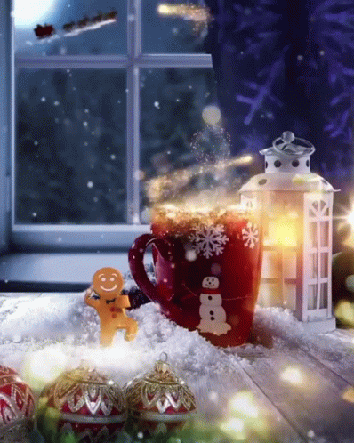 A charming winter scene with a gingerbread man, a steaming mug, and festive decorations by a snowy window.