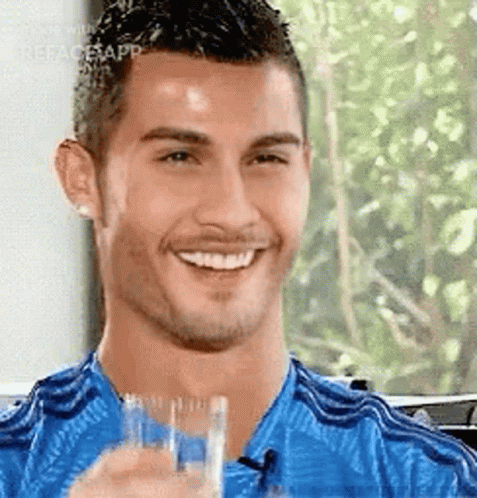 Cristiano Ronaldo smiles and laughs while holding a glass of water.