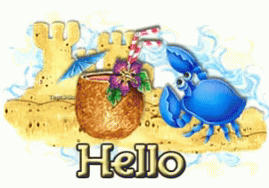 A friendly blue crab waves hello on a sandy beach next to a sandcastle and a tropical coconut drink.