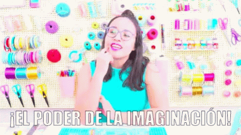 Craftingeek presents the power of imagination, with a woman gesturing enthusiastically in a colorful craft room.