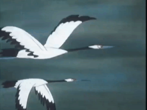 Two elegant cranes with white bodies and black wings fly gracefully through the sky, wings outstretched.