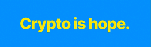 A vibrant blue background displays the yellow text 'crypto is hope', associated with Cranksy's art.