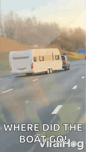 A car towing a caravan loses control on the highway, swerving violently before crashing.