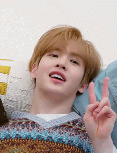 Cravity Allen makes a peace sign and pouts his lips while relaxing on a couch.