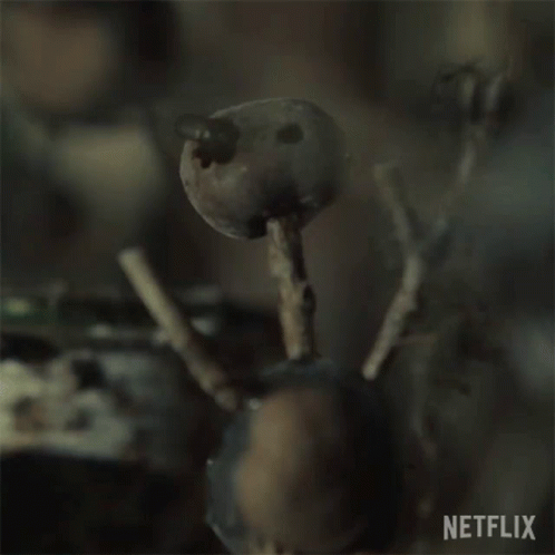 A close-up of a creepy, stick-figure-like chestnut toy from The Chestnut Man series, in a dark setting.