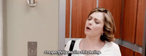Rachel Bloom from Crazy Ex-Girlfriend in an elevator, stating 'I respectfully decline this feeling.'