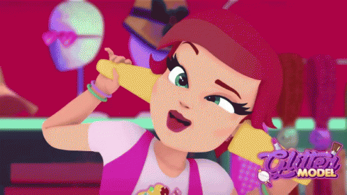 A red-haired cartoon girl talks animatedly on a yellow phone, winking, with the 'Glitter Model' logo.