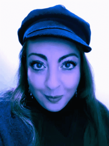 Rocio, wearing a blue hat and earrings, smiles before showing crazy eyes and rolling her eyes playfully.
