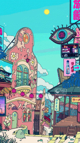An animated loop of a vibrant, fantastical Japanese city with neon signs and a cute ghost appearing.