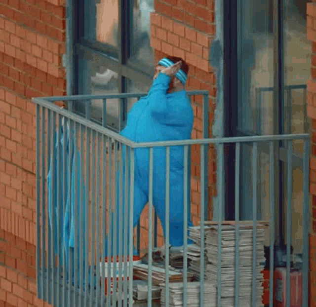 A bearded man in a blue tracksuit and headband performs energetic dance moves on a balcony.
