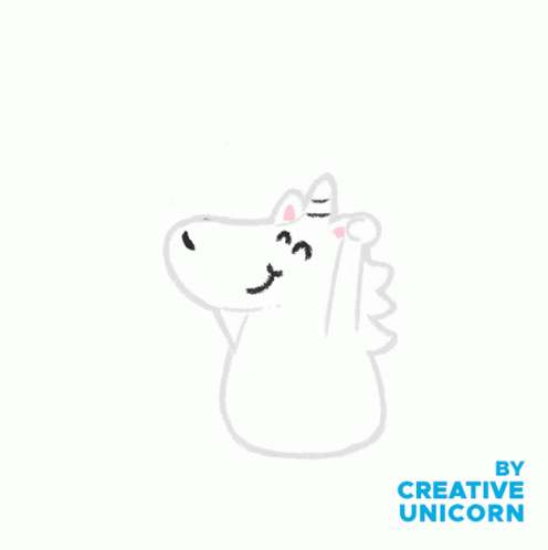 A cute white unicorn from Creative Unicorn brand stretches under a yellow sun with a 'MORNING!' greeting.