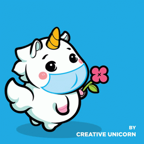 A cute Creative Unicorn wearing a mask and holding a flower tells you to stay home with a playful smack.