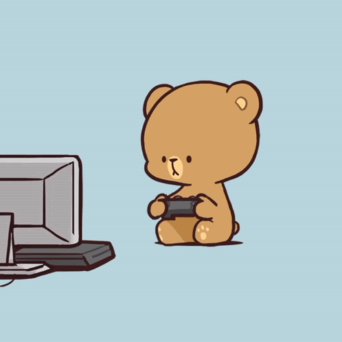 Cute Milk and Mocha Bear characters are engrossed in playing video games on a computer.