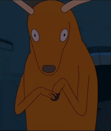 A creepy Adventure Time character, resembling a deer-like creature, looks surprised and moves its hands nervously.