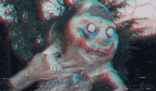 A distorted, glitching image of a creepy clown with glowing eyes and sharp teeth.