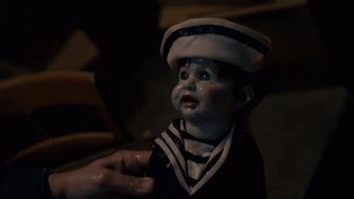 A creepy, evil doll in a sailor outfit is held in a dimly lit setting, its face appearing wet and eerie.