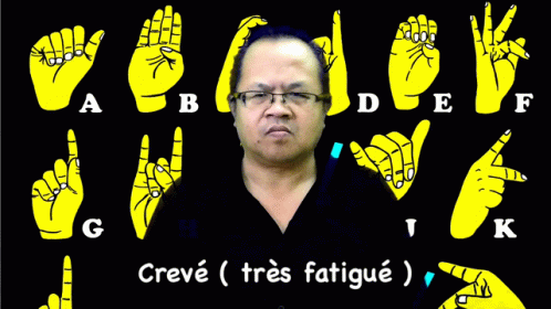 Man demonstrates 'Crevé' (very tired) in French Sign Language (LSF) against an alphabet background.