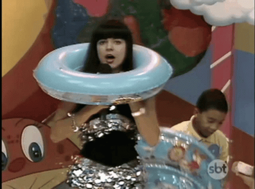 Mara Maravilha on SBT TV, dancing with children and using a swimming float as a prop during a show.